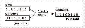 Il existe 16 fonctions de transfert correspondant aux 16 connecteurs binaires de la logique. Pour chacune d'entre elles, un symbole a été défini en C (cf. fig. 6.2. ). La fonction de transfert est effectuée bit à bit entre chaque pixel du dessin source et de la destination. Ainsi la fonction de transfert GXCopy permet d'ignorer la couleur des points de la destination. Avec GXCopy le dessin est directement reporté sur la destination (en général dans la couleur de foreground), sans tenir compte de son contenu antérieur. Inversement, GXnoop et GXinvert ne tiennent compte que des couleurs de la destination. L'effet de la fonction GXxor est illustré figure 6.3.