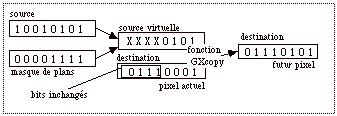Une requête graphique engendre un bitmap représentant les points du dessin (par exemple, un segment de droite avec XDrawLine). Appelons ce dessin initial la source. La requête graphique indique en outre toujours où doit être reporté ce dessin — la destination — et dans quel contexte graphique il doit être effectué. La requête graphique vient alors modifier la destination (en général une fenêtre) en fonction du dessin source et des valeurs des différents attributs du contexte graphique.